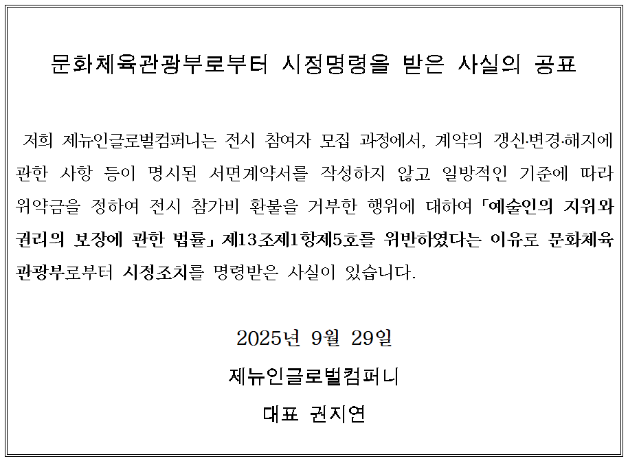 - 공지 [안내]「예술 계약 제대로 시작하기!」2025년 하반기 특강(교육) 신청 안내 25.09.26 +