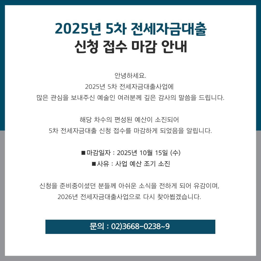 - 공지 [공고]「예술인 전세자금대출 권리조사 시스템 연동 구축 용역」우선협상대상자 공고 25.09.29 +